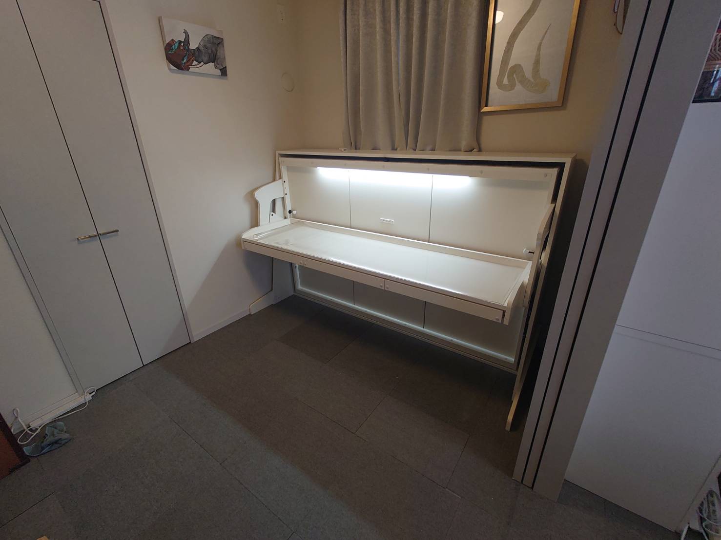 デスクの上のものを片付けることなく、そのままでデスクが水平に下がり、ベッドに早変わり!