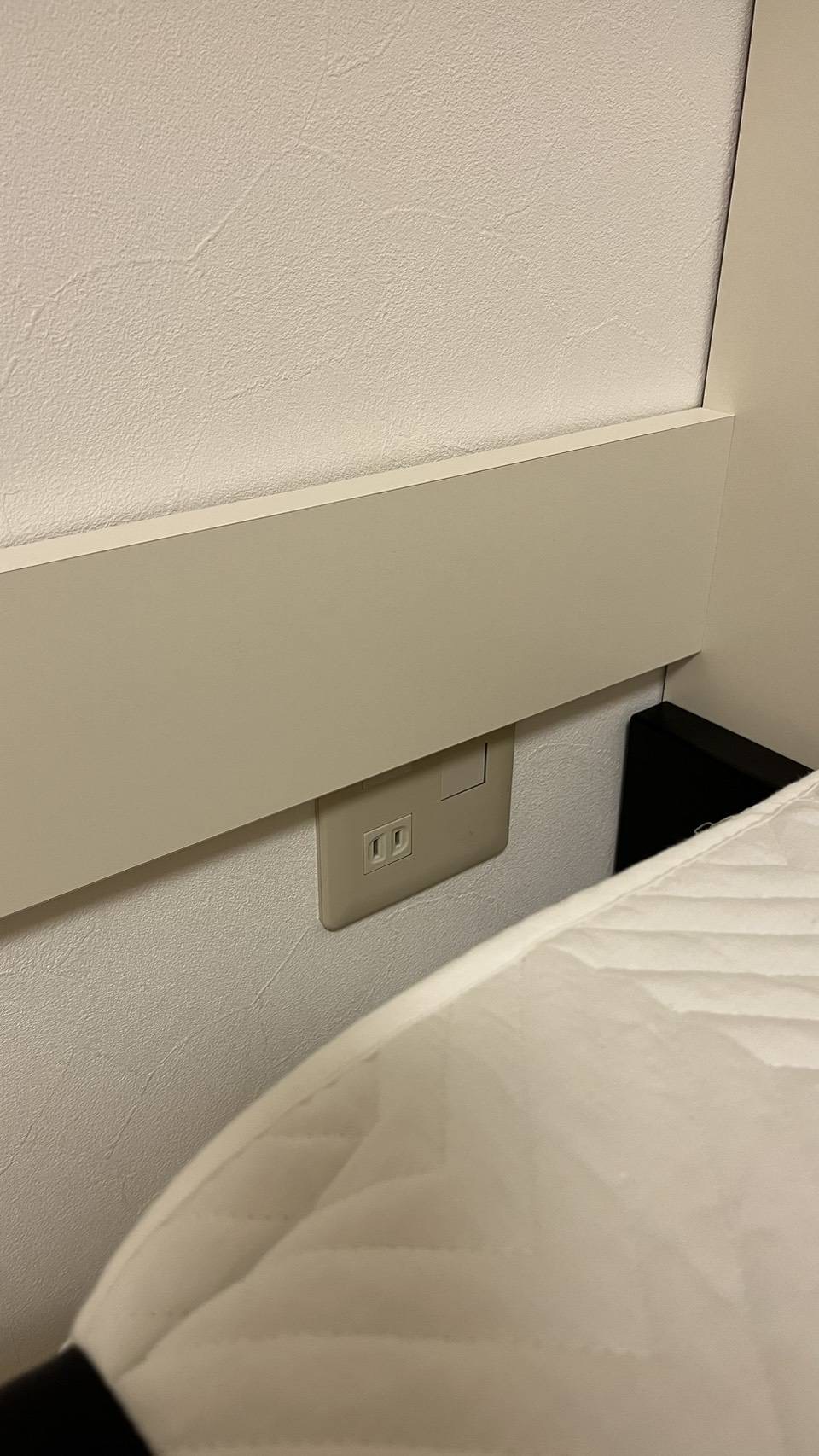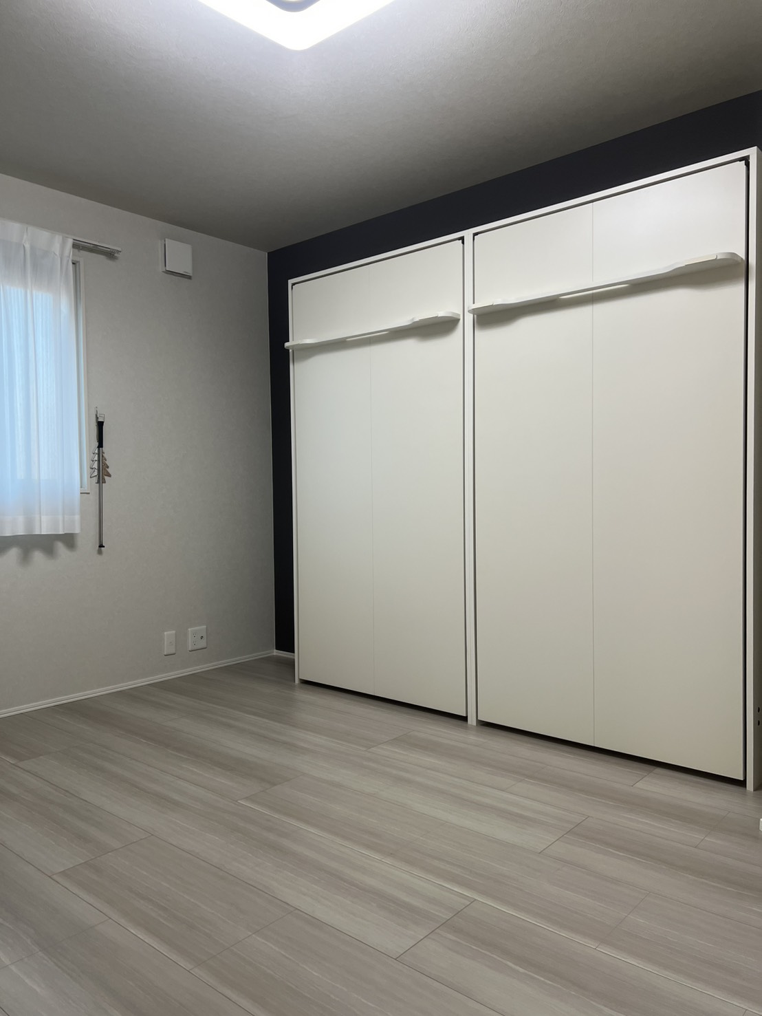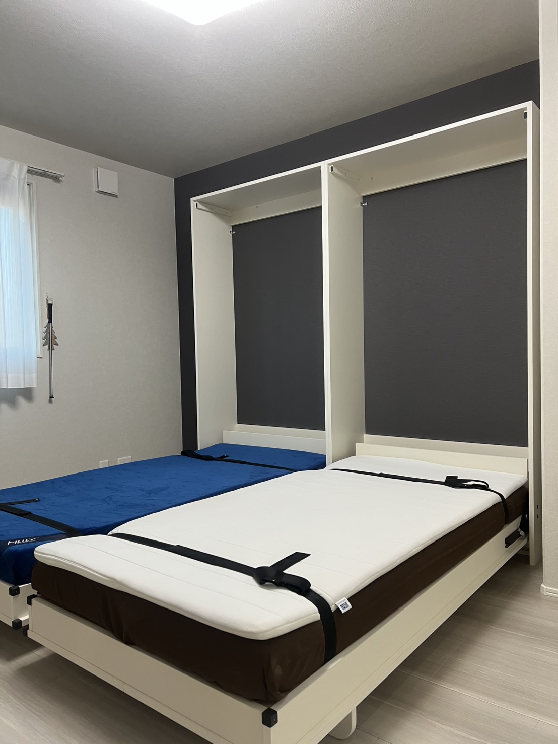 壁収納ベッドは、地震大国の日本では、壁固定必須です。ところが、マンションの戸境壁(こざかいかべ)はマンションの共有部分にあたるため、ビス固定不可の物件が多いものです。このお客様は、突っ張り棒をお客様で用意して頂き、それだけでは、横揺れ防止にならないので、現場で、壁固定はせずに、対策をほどこしました。家具用コンセントも追加でつけました。
