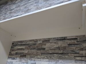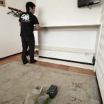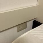壁面にコンセントやスイッチが三か所あり、一か所つぶすことも視野に入れましたが、できるだけコンセント類は今後を考えて使用できるようにしたほうが良いために、三か所すべてを生かして、設置することになりました。上部収納は既存のものです。